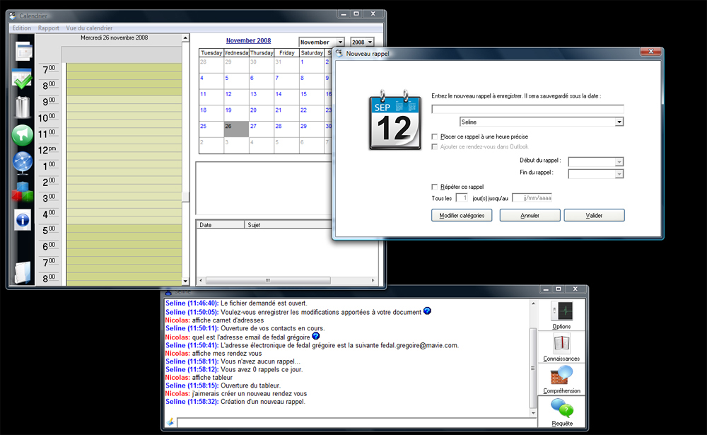Seline comprend votre langage courant, qu'il soit tapé au clavier, prononcé oralement, ou même écrit à main levée sur une tablette. Seline peut donc ensuite effectuer n'importe quelle action. Afficher vos rendez-vous. Afficher un mémo correspondant à un terme précis. Afficher le numéro de téléphone d'un contact. Et même composer directement ce numéro, en Bluetooth, sur votre téléphone portable. Tout ceci depuis une simple fenêtre de discussions.