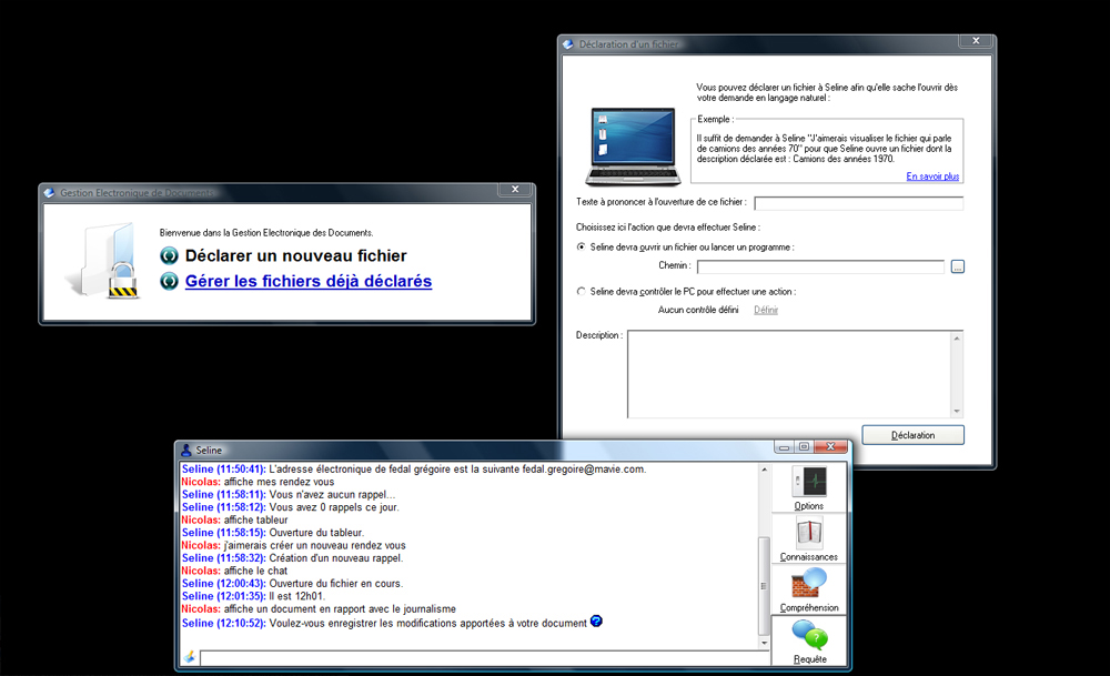 Apprendre à connaitre votre ordinateur tout d'abord. En lui permettant d'indexer le disque dur, Seline peut ouvrir n'importe quel document sur ce dernier pourvu qu'on le lui demande. Avec son Gestionnaire Electronique de Documents (GED), Seline reçoit spécifiquement de votre part les descriptions d'images ou d'autres données (comme de l'audio) et vous les lance à la moindre sollicitation. L'Intelligence Artificielle de Seline n'est en aucun cas figé.