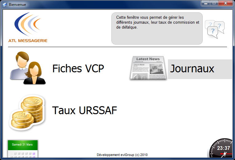 • ATL Messagerie a fait appel a evi dans le cadre du développement d'un logiciel de gestion des Ventes Colporteurs de Presse. Ces personnes, distribuant des journaux, ont un salaire calculé sur le nombre de journaux vendus, la référence des journaux (certaines distributions étant plus généreuses que d'autres) mais aussi sur des primes. Le calcul des salaires, des références des journaux, et des charges sociales n'est donc pas une mince affaire.