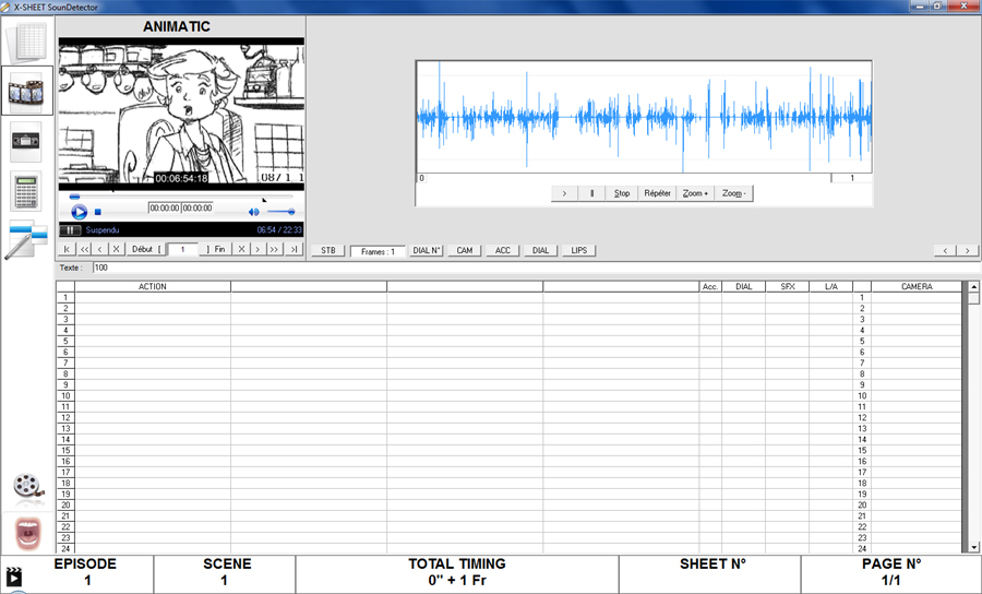 X-Sheet Sound Detector est un logiciel unique permettant le sous-titrage et le doublage des dessins animés. Il permet de remplir les fameuses 'X-Sheets" utilisées dans ce milieu. Il est possible de couper des séquences, voir le résultat et la forme de la bouche d'un personnage pour pouvoir rajouter la syllabe, image par image.